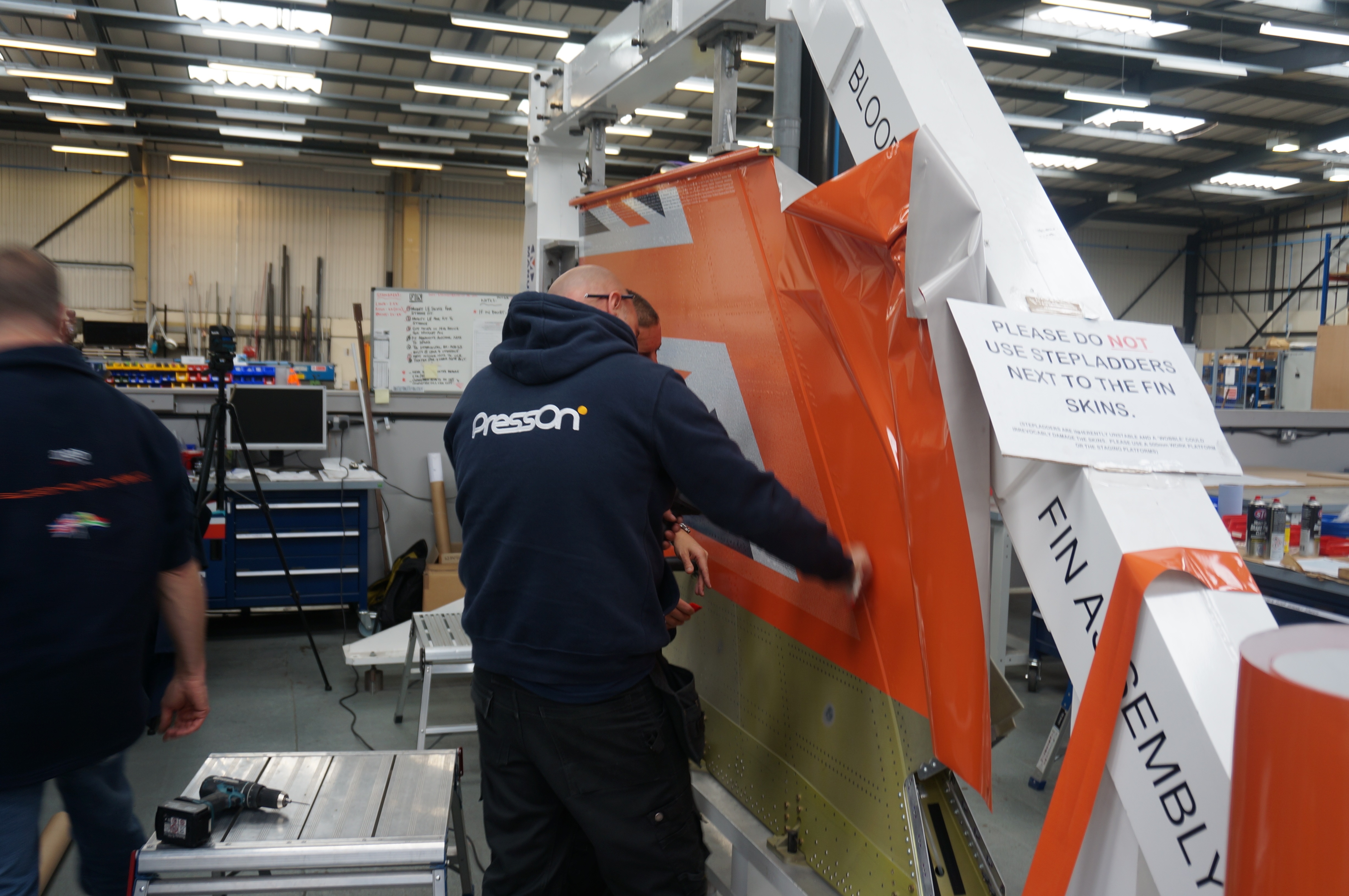 PressOn have again worked with the team building Bloodhound SSC, this time wrapping the giant tail fin – a vital part of the supersonic car that provides stability. The Bloodhound is poised today, 26 October 2017, for trials on the runway at Newquay Airport in Cornwall. The car will be driven at speeds up to 200 mph, testing aerodynamics, steering, brakes, suspension and data systems. Due to the extreme forces at work on the tail fin, the video above shows stress and load testing of the fin, prior to the trials.